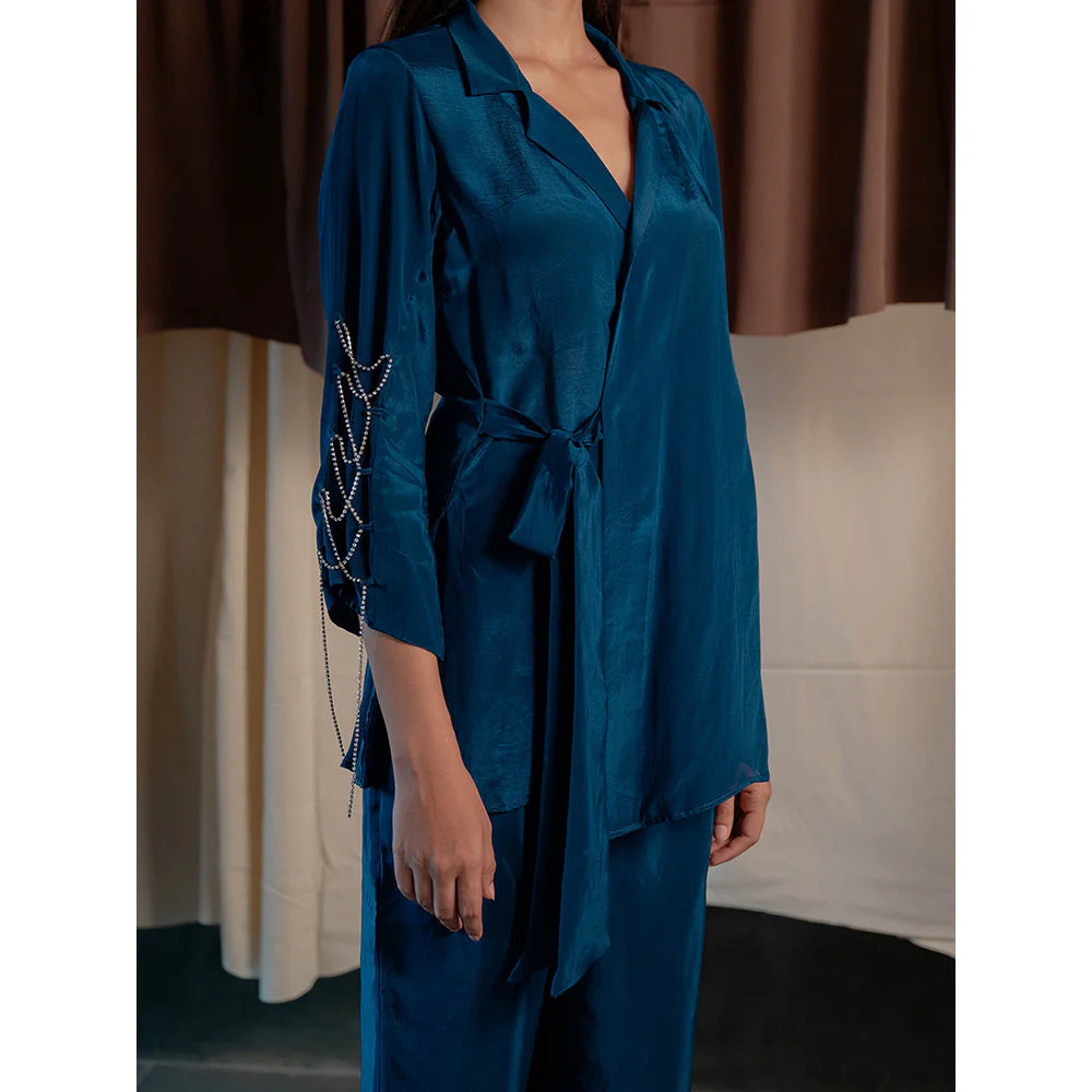 Description : Elevate Your Style with This Wrap-Around Coat Style Top and Coordinating Bottom. The Top Is Designed with Chic Criss-Cross Stone Detailing On The Sleeves, Adding A Touch Of Glamour To Its Sophisticated Silhouette.